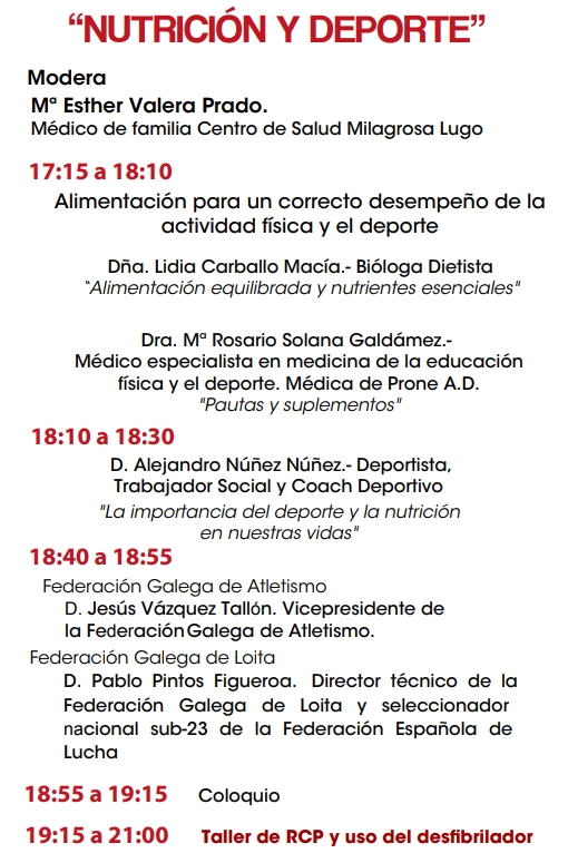 Desde las 5:00 p.m. hasta las 8:00 p.m., en el Auditorio de “O Vello Cárcere” en Lugo, habrá charlas-coloquios sobre diferentes temas destinados a informar a los ciudadanos sobre la importancia de practicar un deporte saludable y seguro. Asimismo, como enlace a todas las disciplinas deportivas y como complemento de estas charlas, destacar la importancia de la cardioprotección en cualquier competición deportiva, para ello se realizarán talleres de RCP / SVP con el uso del DESFIBRILADOR llevados a cabo por "Project + Lifetime". 5 minutos son cruciales para salvar una vida ".